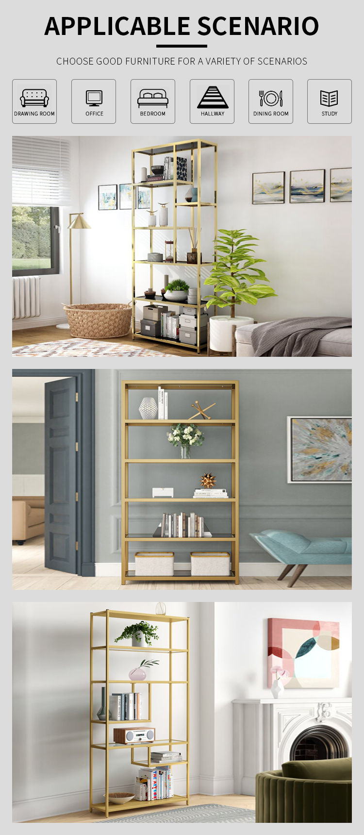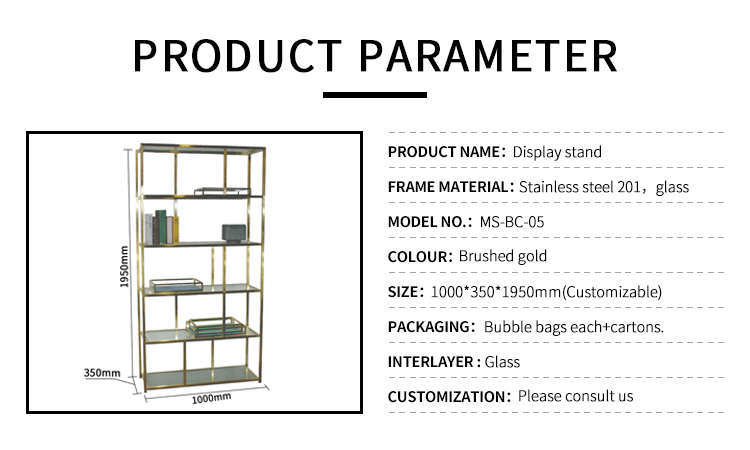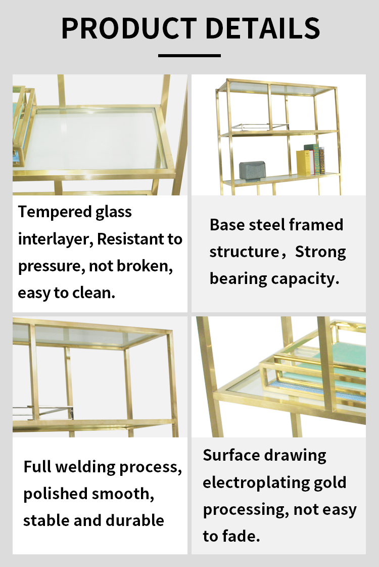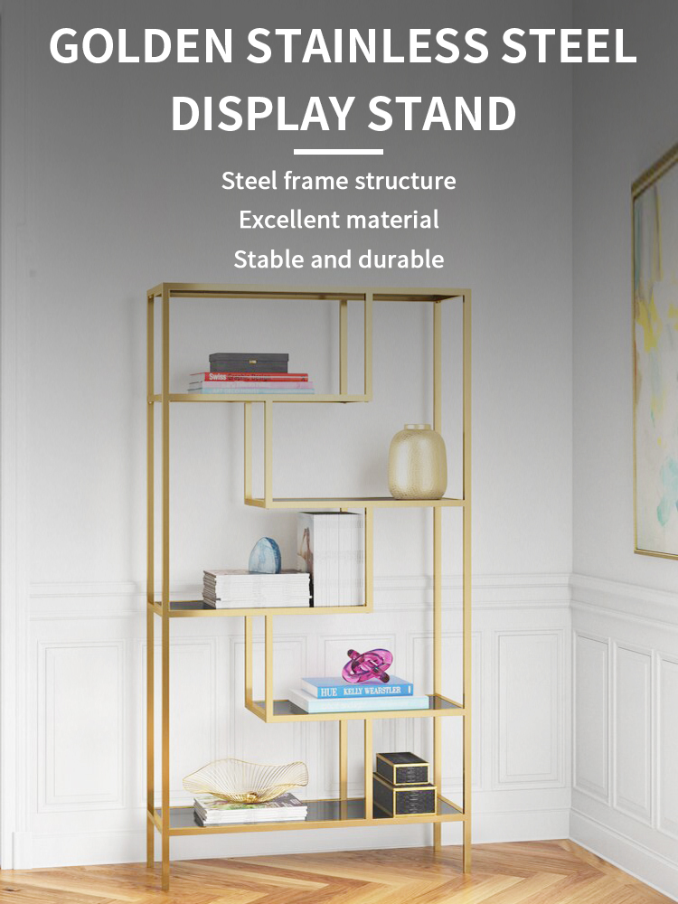 Modern light luxury gold stainless steel display stand,glass laminated bookshelf